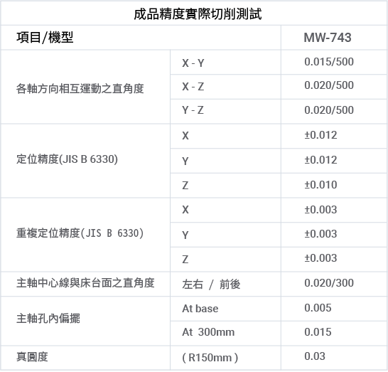 1. W 軸雙螺桿雙伺服馬達驅動,定位精度可達 0.03MM , W 軸可任意位置定位,不受加工區域限制。