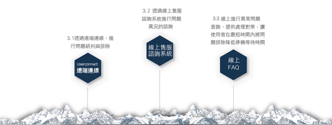 線上進行異常問題查詢,提供處理對策資料及影片,讓End User 在最短時間內迅速將問題排除,大幅降低停機待修等待時間